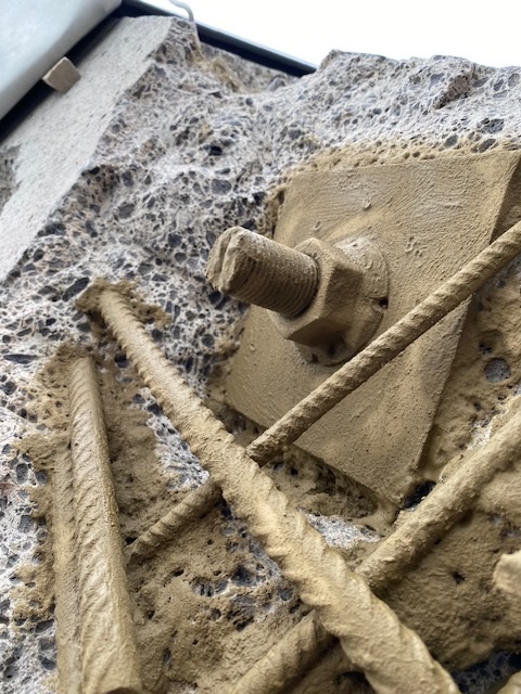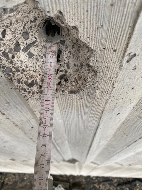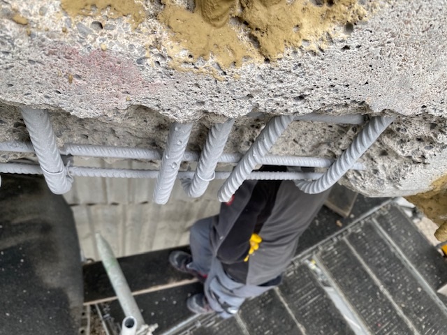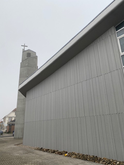 Historie und Sanierungsbedarf: Die St. Galluskirche in Haßloch wurde Anfang der 1970er Jahre als Stahl- und Spannbetonbauwerk errichtet. Besonders markant ist das Dach, das als mehrfach gekrümmte Schale konstruiert wurde, die sich um einen Ringbalken aus Spannbeton legt. Mit den Jahren zeigten sich jedoch diverse Schäden an den Betonflächen und Stahlkomponenten. Die Karbonatisierung des Betons führte zu Rostbildung, und der Stahl war schließlich teilweise freigelegt.