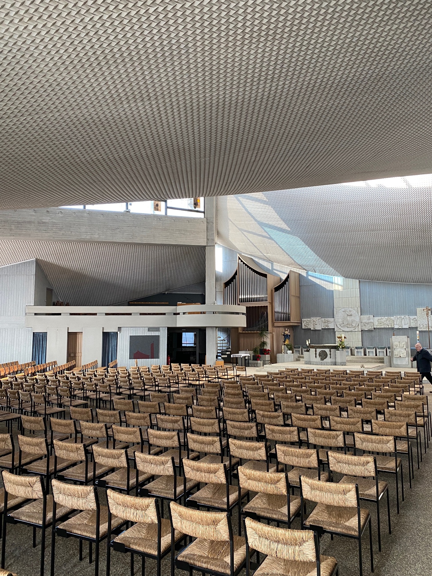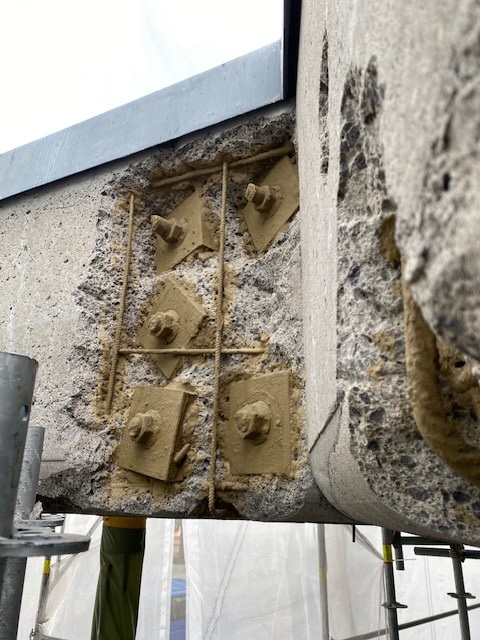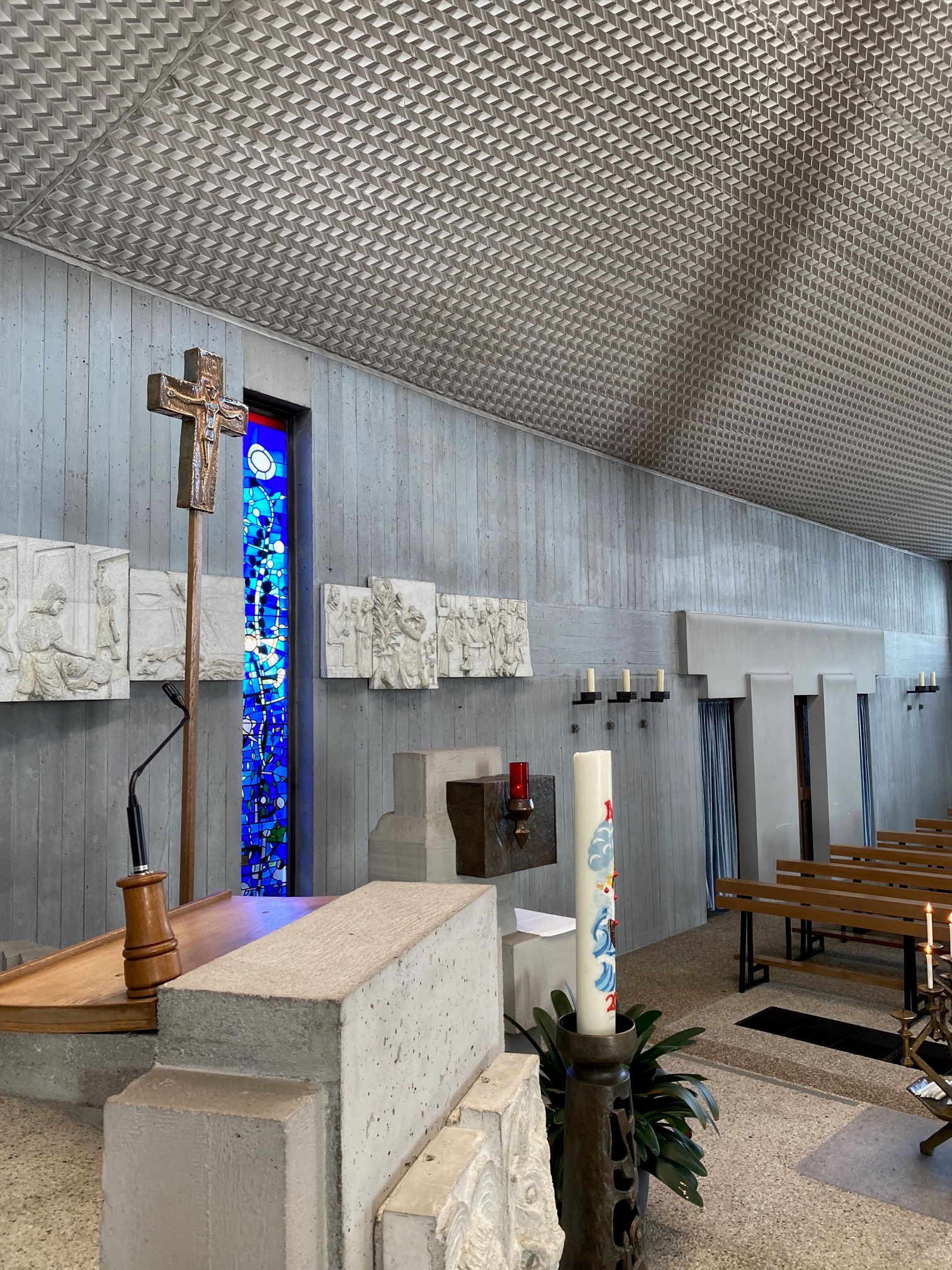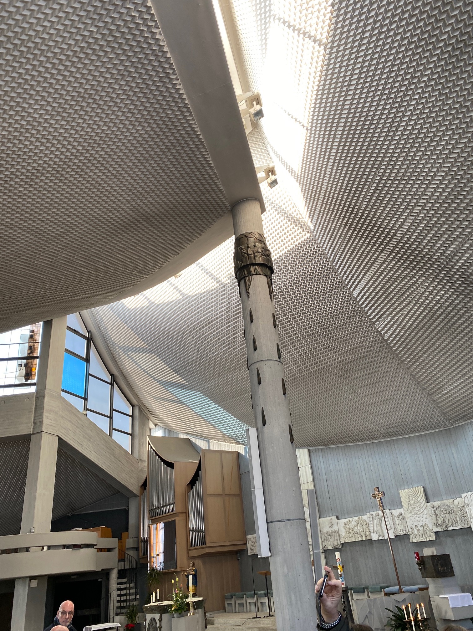 Umfassende Instandsetzung: Das Sanierungskonzept für die Kirche sah vor, sowohl die Spannglieder und den Ringbalken zu verankern und zu reparieren als auch die beschädigten Fassadenflächen aus profiliertem Sichtbeton zu restaurieren. Zahlreiche Abplatzungen an den Profilierungen und Portalen wurden behoben, und alle Betonoberflächen erhielten einen speziellen Oberflächenschutz.
